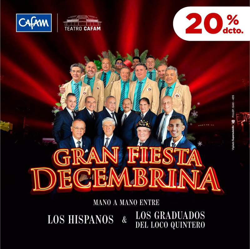 Con más de cinco décadas de historia, Los Graduados marcaron a toda una generación con su estilo inconfundible y éxitos que se convirtieron en clásicos de la música bailable como, Así Empezaron Papá y Mamá y Alumbra Luna. Por su parte, Los Hispanos, con una trayectoria igualmente legendaria, han puesto a bailar al país entero con su ritmo vibrante y su legado artístico que permanece vivo en cada escenario. En una sola tarima, estas dos agrupaciones harán vibrar al público con un repertorio que evoca recuerdos, despierta emociones y enciende la fiesta de fin de año. -